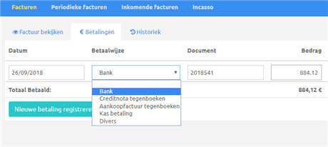 Volg je toch liever zelf je betalingen op, dan kan dat net zo makkelijk, in de Betaal tab van elke uitgaande of ingekomen factuur. Hier registreer je ook betalingen via Kas en punt je facturen en creditnota’s tegenover mekaar af.