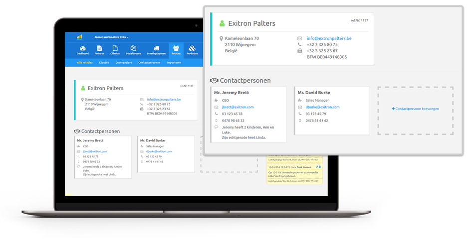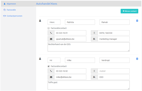 Bij grotere bedrijven heb je vaak met meerdere personen contact. Geen probleem voor Bilansoft, die voer je netjes in. Is er een vast facturatiecontact, dan kun je dat aangeven, maar je stuurt net zo vlot je facturen naar een van de andere contacten.