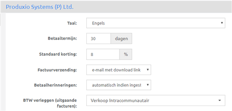 Bij Klanten en leveranciers kun je allerlei instellingen bepalen: afwijkende betaaltermijnen, standaard kortingen, tot welke boekhoudcategorie ze behoren, hoe ze hun facturen wensen te ontvangen, wat het BTW-regime is, hun bankrekening etc. Heb je dit een maal goed ingevoerd, dan staan alle instellingen bij een volgende factuur of betaling automatisch goed!